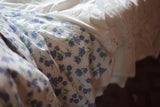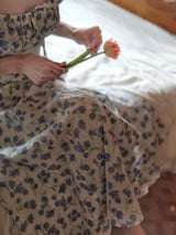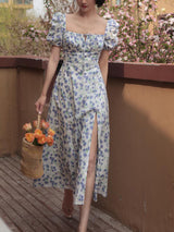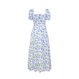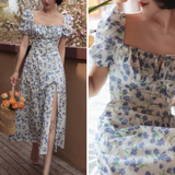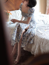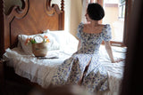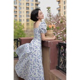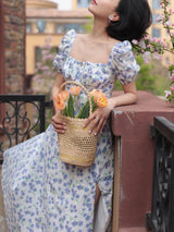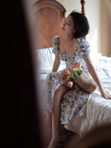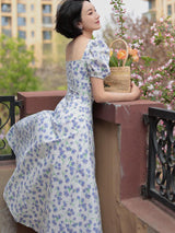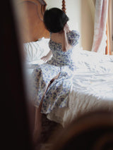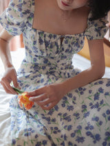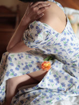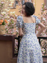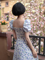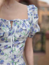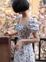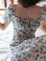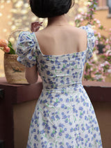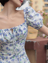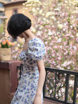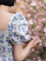 色鮮やかな青藤色の花模様が描かれたフレンチレトロなワンピース。胸元はリボンを結べるようになっており、ふんわりと膨らんだ袖が愛らしい。ハイウエストなデザインで、綺麗に着こなすことができます。花の香りを漂わせた見目麗しい女性に。