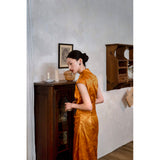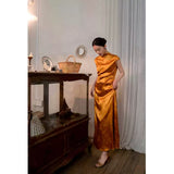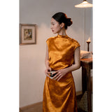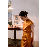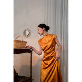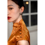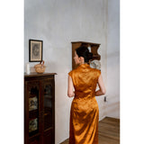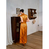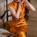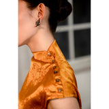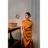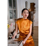 光沢感のある艶めきが洗練されたエレガントな雰囲気に演出してくれるチャイナワンピース。肩をわずかに覆ったハイネックなデザインで、肩部分には貝ボタンが装飾されています。妖艶で官能的なチャイナに魅せられて。