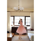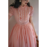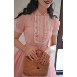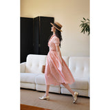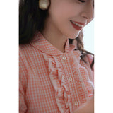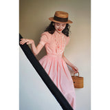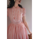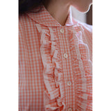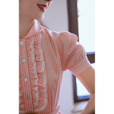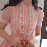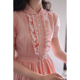 1950年代の優雅なフォルムを残しながら、春にふさわしい軽やかなシルエットへと仕上げたギンガムチェック柄のワンピース。貝殻ボタンの両側に繊細なレースとフリルが施されています。スカート部分はふんわり広がるフレアなシルエット。ディテールに宿るヴィンテージの美学を堪能して。