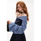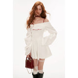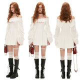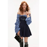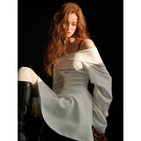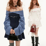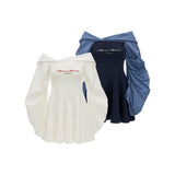 異なるテクスチャを組み合わせたドッキングワンピース。肩まわりを大胆に魅せたオフショルダーが印象的。袖はたっぷりとしたボリュームのあるロングスリーブ。ウエストラインを絞り、スカート部分はふんわりと広がるシルエットとなっています。ロマンティックかつエッジの効いたアイテム。
