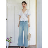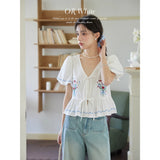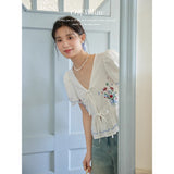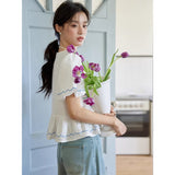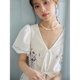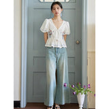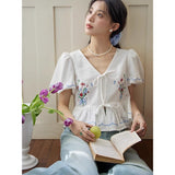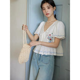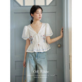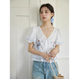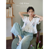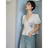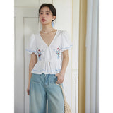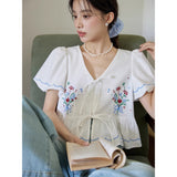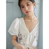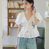 咲き誇る色鮮やかな花々を束ねた刺繍が施されたブラウス。ふんわりと広がるペプラムシルエットがウエストを細く、全体をフェミニンに見せてくれる。袖はボリュームのあるパフスリーブで、裾と袖口にはウェーブのサックスブルーのステッチが入り、遊び心のあるアクセントに。
