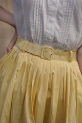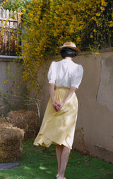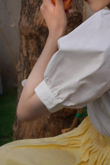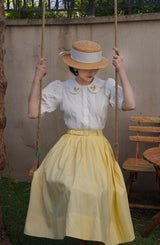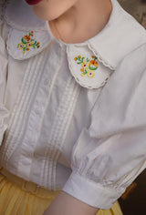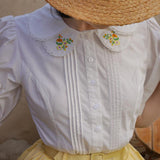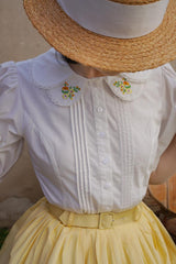 襟部分に鮮やかに咲いた小さな花を刺繍したレトロなブラウス。胸元にはプリーツがかかっており、肩部分に膨らみを持たせたデザイン。清純で華やかな貴婦人を演出してくれる。レトロで愛らしい雰囲気に、纏うだけで胸が高鳴ります。