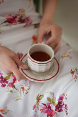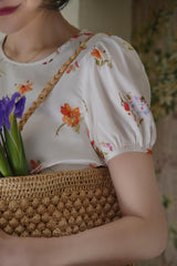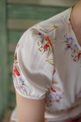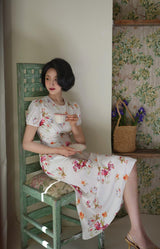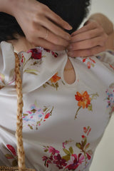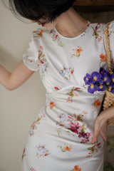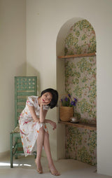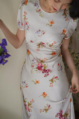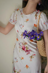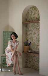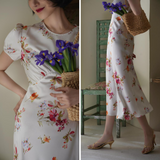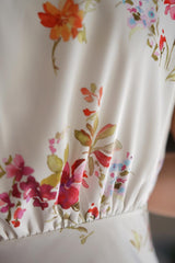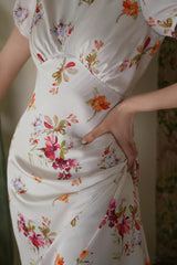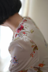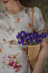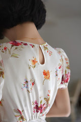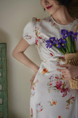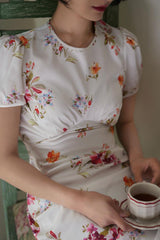 魅惑的な美しさに感嘆の溜息が溢れてしまう。色鮮やかに咲いた花々を水彩で描いたエレガントなワンピース。控えめながら、華やかな印象を与えてくれる。ウエスト部分を強調させたシルエット。時代を超えて愛される。美しき煌めきで視線を奪って。