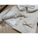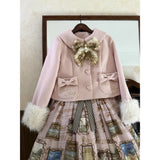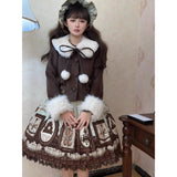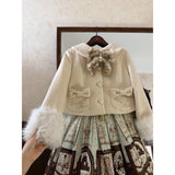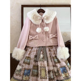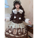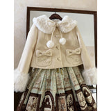 冬の物語を紡ぐようにデザインされたロマンティックなショートコート。ふんわりとしたウール地に、袖口と襟元を包み込むファーが雪のような柔らかさを添えます。ハート型のボタンや大きなリボンポケットには金糸の刺繍が施され、「Winter Story」の文字がささやくように光を受けて輝きます。まるでおとぎ話の主人公のような、温もりと可憐さを併せ持つ一着。