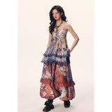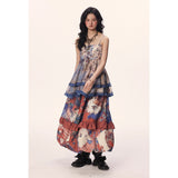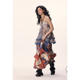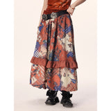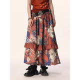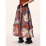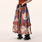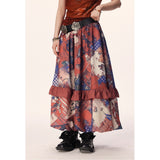 和柄のような文様が全体にちりばめられた、異国情緒と懐かしさが交錯するロングスカート。赤や藍を基調に、チェックや植物、人物画など多様なモチーフがパッチワークのように構成されており、どこかストーリー性を感じさせるデザイン。中段のフリルが立体感とリズムを生み出し、歩くたびに軽やかに揺れる印象。大胆で個性的でありながら、どこか郷愁を誘うような温かみのある一枚。