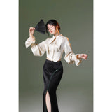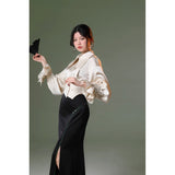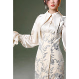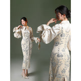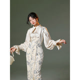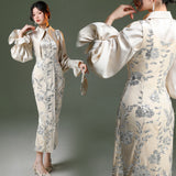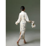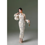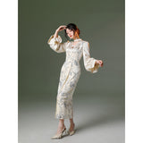 透明感と美しい不透明さが交互に現れる銀色の花をスパンコールで装飾したストラップワンピース。ウエスト位置が高く、綺麗なシルエットでお召しいただけます。冷たく清らかで神秘的な印象を与えてくれるアイテム。