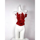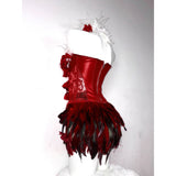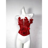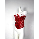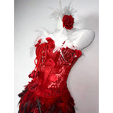 赤を極限まで昇華させ、最も艶やかな官能の色。華やかでドラマチックなデザインの刺繍コルセット。赤を基調としたサテン生地のコルセットには、繊細なレースと立体的なバラの装飾が施されており、ゴージャスな雰囲気を醸し出しています。