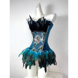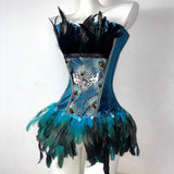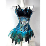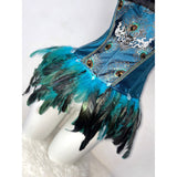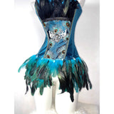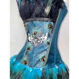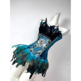 光を万華鏡の色に変え、幾何学的な美を築く孔雀の羽。孔雀の羽を思わせる鮮やかなブルーと緑を基調に、孔雀の目をイメージした刺繍やビーズ装飾が特徴的なコルセット。胸元と裾部分には黒や青の羽根が贅沢にあしらわれており、動きに合わせて流れるようなエレガントな印象を与えます。