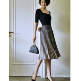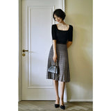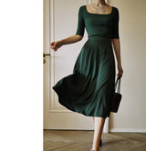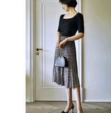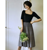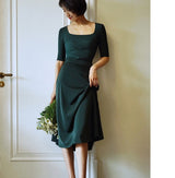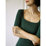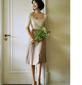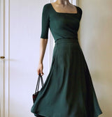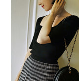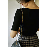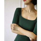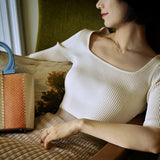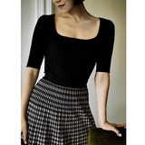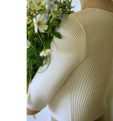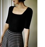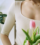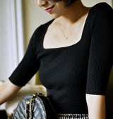 スクエアネックが美しい。しなやかな女性らしいフォルムを可憐に彩ってくれるハーフスリーブのスリムニット。細身のスタイルでフェミニンな雰囲気を醸し出してくれるアイテム。