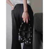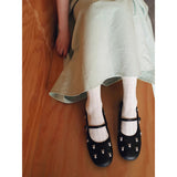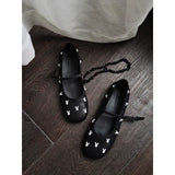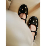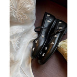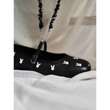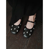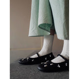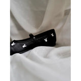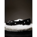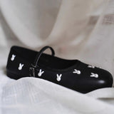 艶やかなブラックのボディに、真珠のような光沢を放つ白いウサギがちりばめられた、幻想的なメリージェーンシューズ。月の神話や童話的な世界観を想起させます。柔らかな丸みを帯びたつま先と、華奢なストラップが足元を優しく包み、日常にそっと物語を添えてくれるような存在感。