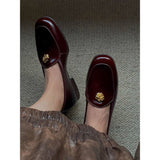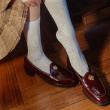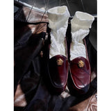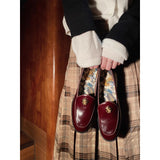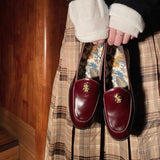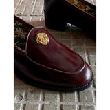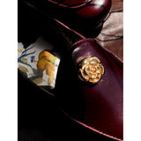 金色に輝く椿の花が装飾されたローファー。控えめながら凛と咲く花が放つ美しさ。艶やかなレザーが、光を受けて上品に輝き、足元にエレガントな重厚感を添えます。靴のインソールには花や果実の絵画が描かれており、見えない部分にも美意識が宿っています。