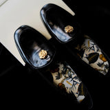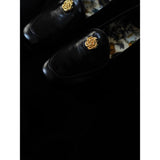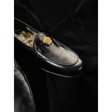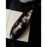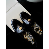 金色に輝く椿の花が装飾されたローファー。控えめながら凛と咲く花が放つ美しさ。艶やかなレザーが、光を受けて上品に輝き、足元にエレガントな重厚感を添えます。靴のインソールには花や果実の絵画が描かれており、見えない部分にも美意識が宿っています。
