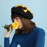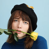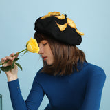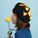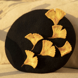 金色の銀杏の葉を散らした羊毛フェルトのベレー帽。ウール特有のふくらみと柔らかさのある素材感が特徴的。陽光に照らされて煌々と輝く銀杏が美しい。自由な角度で左右に傾けて、お好みのスタイルでお楽しみください。
