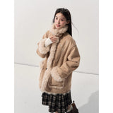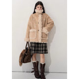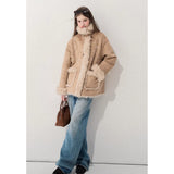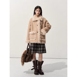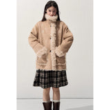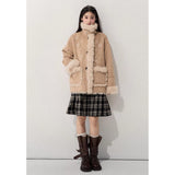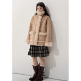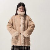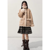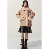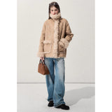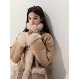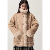 やわらかなベージュトーンのボディに、花々の刺繍を施したスウェードコート。前立て、襟元、袖口、ポケットの縁には、ふっくらとしたファーが施されています。素朴な刺繍模様が布の奥でささやくように浮かび上がる、丸みのあるシルエットと程よいボリューム感が特徴的なアイテム。