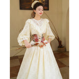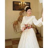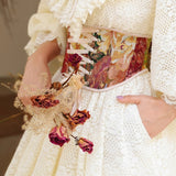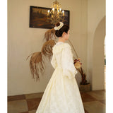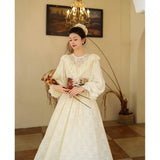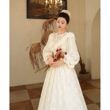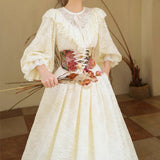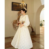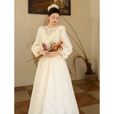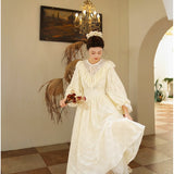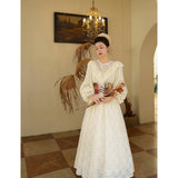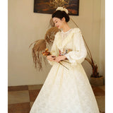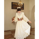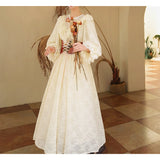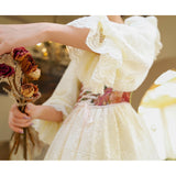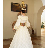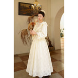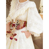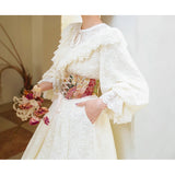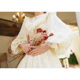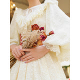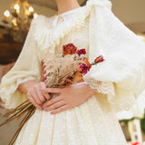 まるで古い物語の中から抜け出したようなロマンティックなロングワンピース。繊細な総レースが全身をふんわりと包み込み、淡いクリーム色の光をまとうように佇んでいます。胸元には上品なレースの切り替えと柔らかなフリルが幾重にも重なり、たっぷりとギャザーを寄せたスカートは動くたびに波のように広がります。ボリュームのあるスリーブと繊細なカフレースがクラシカルな気品を引き立てます。アンティークドレスのような優雅さと、純白のロマンが共鳴する特別なワンピース。