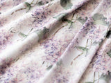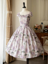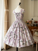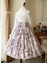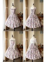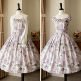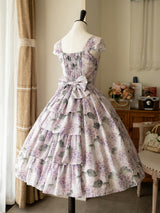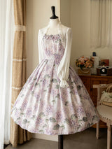 幻想的な紫色の花を咲かせた紫陽花を描いた水彩画のワンピースとボレロカーディガン。胸元にはフリルが装飾され、バックには取り外し可能なリボンが装飾されており、段を重ねたようなデザインとなっています。ふわっと広がる裾がエレガントな雰囲気を演出してくれる。さらっとしたなめらかな生地感のアイテムです。ショート丈のボレロカーディガンにはうっすらと花柄が描かれています。