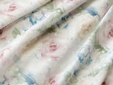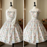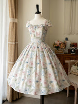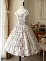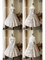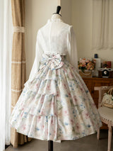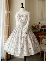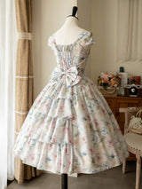 色とりどりに咲いた薔薇の花を描いた油彩画のワンピースとボレロカーディガン。胸元にはフリルが装飾され、バックには取り外し可能なリボンが装飾されており、段を重ねたようなデザインとなっています。ふわっと広がる裾がエレガントな雰囲気を演出してくれる。さらっとしたなめらかな生地感のアイテムです。ショート丈のボレロカーディガンにはうっすらと花柄が描かれています。