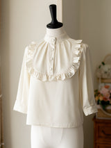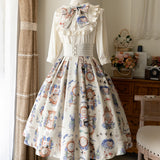 骨董屋の片隅に置かれているような西洋時計と花束が描かれたコルセットスカートとハイネックなリボンブラウス。スカートは、ウエスト部分にコルセットが装飾されています。優雅で美しい古城、絢爛に輝く宝石、空を舞う小鳥も描かれています。ブラウスは胸元にフリルをあしらった装飾が施されています。胸元のリボンは取り外しが可能となっています。ロマンティックなお嬢様を演出してみて。