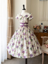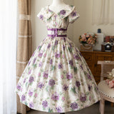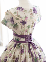 たわわに実った葡萄を水彩で描いたクラシカルなワンピース。まるで大粒の宝石を散りばめたみたい。ウエスト幅が広く、バックに編み上げが装飾されています。ふわりと広がるスカート部分がエレガントな雰囲気を演出してくれる。