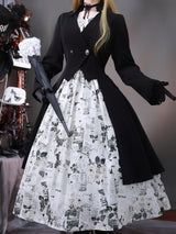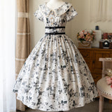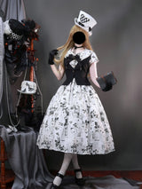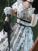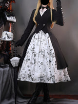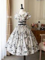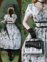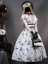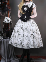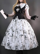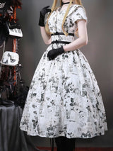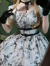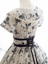 西洋の古新聞に白薔薇を組み合わせたクラシカルなワンピース。モノクロのコラージュデザインはノスタルジックな雰囲気が漂います。ウエスト幅が広く、バックに編み上げが装飾されています。ふわりと広がるスカート部分がエレガントな雰囲気を演出してくれる。