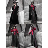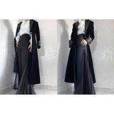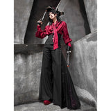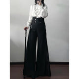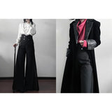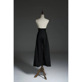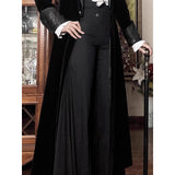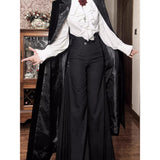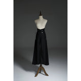 貴族的でミステリアスな雰囲気を醸し出したハイウエストなブラックパンツ。ウエスト部分には編み上げのディテールが施され、裾にはプリーツと透け感のある生地が重なっています。動くたびに揺れるシルエットが美しく、エレガントで洗練された印象を与えます。
