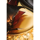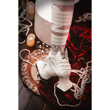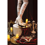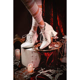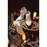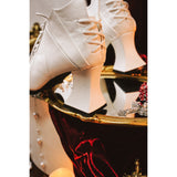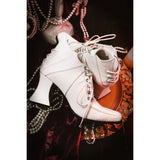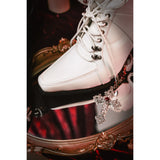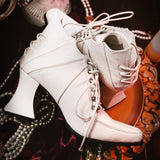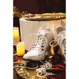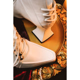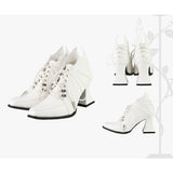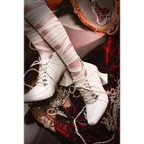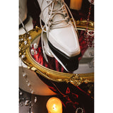 ゴシック調を纏った、アートピースのようなレースアップヒールシューズ。シャープなスクエアトゥに、くびれた台形ヒールが特徴的。アッパーには編み上げディテールとメタルパーツが配置され、構築的でモードな印象を与えます。側面の立体縫製やサイドラインの切り替えも印象的で、角度によってシルエットが美しく際立ちます。まるでファンタジーの世界から抜け出してきたような存在感を放つアイテム。