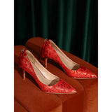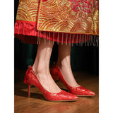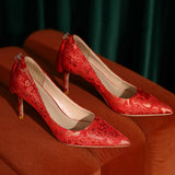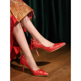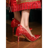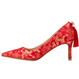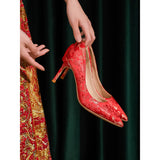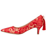東洋の美意識を宿した花唐草文様と龍が織り込まれたポインテッドトゥハイヒール。かかと部分にはクリスタルと揺れるタッセルをあしらい、歩くたびにエレガントな輝きを放ちます。気品と豪華さを兼ね備えたアイテム。