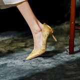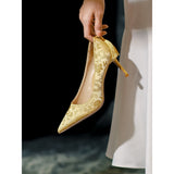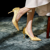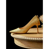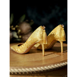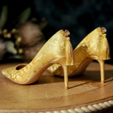 東洋の美意識を宿した花唐草文様と龍が織り込まれたポインテッドトゥハイヒール。かかと部分にはクリスタルと揺れるタッセルをあしらい、歩くたびにエレガントな輝きを放ちます。気品と豪華さを兼ね備えたアイテム。