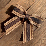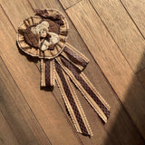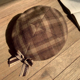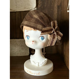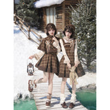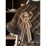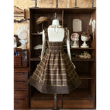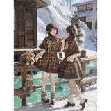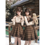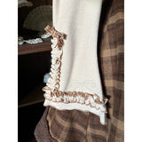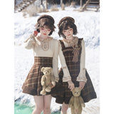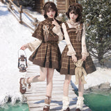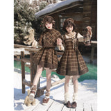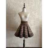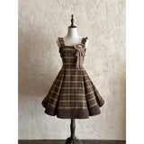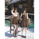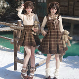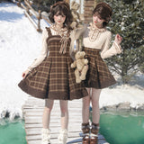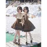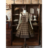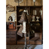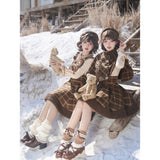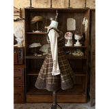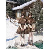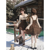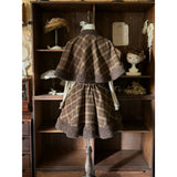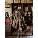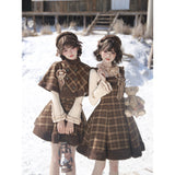 まるで冬の午後の物語そのものを身に纏ったかのような、素朴で甘い佇まいのジャンパースカートとスカートとケーブとトップス。深いブラウンのチェック生地が静かに揺れ、ふっくらとした起毛の縁取りをまとったジャンパースカートとスカートがやわらかな丸みを描きます。重ねられたケープは肩先に温もりを宿しながら愛らしいリボン飾りを添え、内側に覗くベージュのトップスは繊細なフリルと袖口の装飾で全体に軽やかな奥行きを与えてくれる。