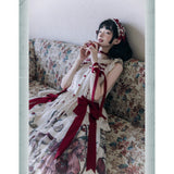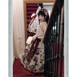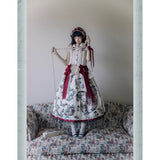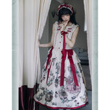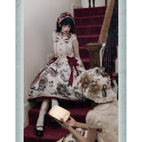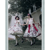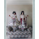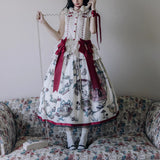 白ウサギと不思議の国の住人たちが描かれた、童話世界から飛び出したようなクラシカルなスカート。赤いパイピングが絵本の枠を縁取るようにデザインされ、スカート全体がまるで物語のページのように広がります。ロマンチックで夢見心地な印象の中に、どこかシュールでユーモラスな空気も漂う一着。