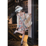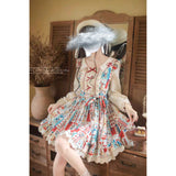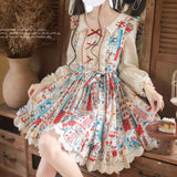 絵本の世界に迷い込んだような世界観のワンピース。赤・青のアクセントが効いたヴィンテージ調のプリントが施されたジャンパースカートとブラウスを組み合わせたアイテム。レトロで可愛らしいイラストが描かれており、異なる柄を組み合わせたパッチワークデザインが、どこかノスタルジックで新鮮。胸元のリボンやギャザー、裾のアイレットレースが甘さを添えつつ、立体的なシルエットで子供っぽくなりすぎない上品さも演出しています。