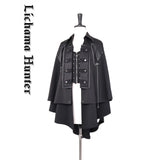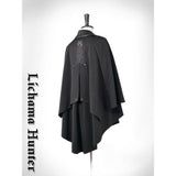 毅然と貫く意志の強さを感じさせてくれるケープとローブとワンピース。ケープは軍装を思わせる装飾を前面に配し、アシンメトリーな裾が揺れるデザイン。背面にはクロスと光線を模した刺繍が施され、神秘的で力強い印象を放っています。ローブは深い闇を纏うように全体が黒で統一され、袖には僅かな装飾のドレープが流れる、儀式的な存在感を持つデザイン。ワンピースは立ち襟とフロントボタンが整然と並び、鋭くも端正なフォルム。細部に施された切り替えやタックが繊細で、ゴシックな世界観と重厚感を漂わせています。