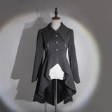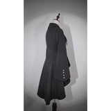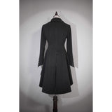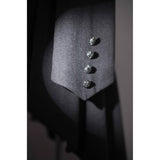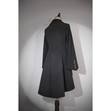 ヴィクトリア朝時代を想起させるクラシカルなロングコート。ウエストから裾にかけて広がるアシンメトリックなシルエットと、フロントに並ぶ装飾的なボタン、鋭角的なラペルが特徴的。袖口にもボタンが配置され、バックスタイルも美しい仕上がりになっています。
