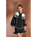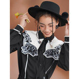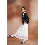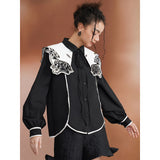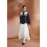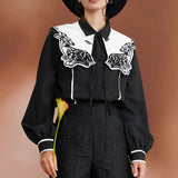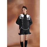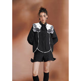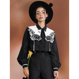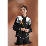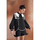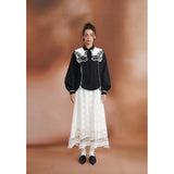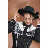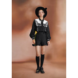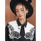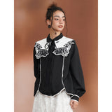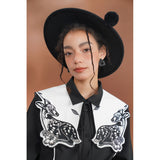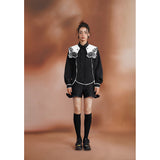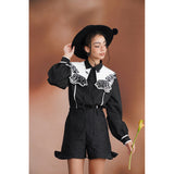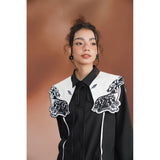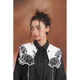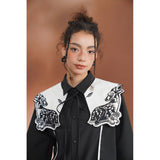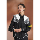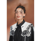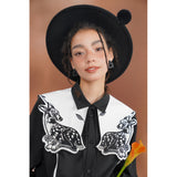 森の宝石のような存在。森の精霊のような存在。森の奥深くを軽やかに駆けて、幻影のように、一瞬の美しさを残して消える子鹿。好奇心旺盛な小さな冒険者にとって、大きな瞳に映る世界は、すべてが新鮮で輝いている。そんな子鹿の刺繍付け襟とブラウス。ブラウスは、黒を基調としたシックなデザインで、白のパイピングが施されています。
