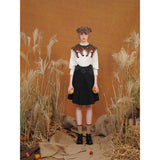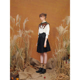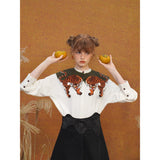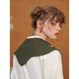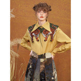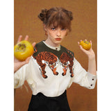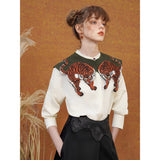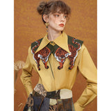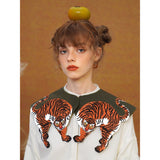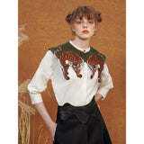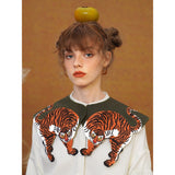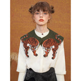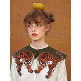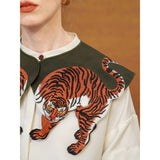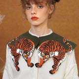 密林の奥深くの葉陰に蠢く獰猛な虎が刺繍された付け襟。静まり返った静寂に紛れ潜む虎。獲物を狙った鋭い眼差し。美しい躍動感と神秘的な存在感に魅了される。そこは空想の楽園へ迷い込んだような幻想的な世界。