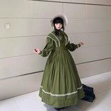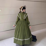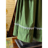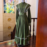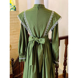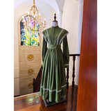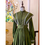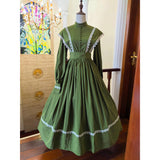 深い森の静けさをそのまま纏ったようなクラシカルなワンピース。苔むすようなオリーブグリーンの生地に、繊細な白のレースが縁取られ、自然の中に差し込む光を思わせるコントラストを描きます。高めのスタンドカラーと連なるくるみボタンが端正な印象を与え、肩から胸元へと流れるレースラインが優美な縦のシルエットを強調。ふんわりと広がるスカートは気品を湛えつつも素朴で、背中の大きなリボンが柔らかな余韻を添えます。まるで19世紀の物語の中、森の館に暮らす少女が着ているかのような、ノスタルジックで静謐な一着。