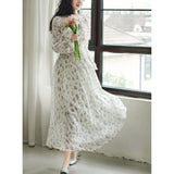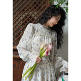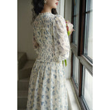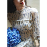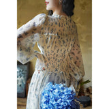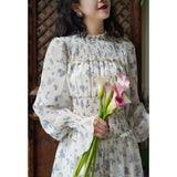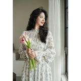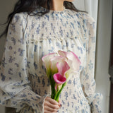 まるで海辺の風を纏ったかのようなフレンチレトロなワンピース。繊細なシフォン素材にブルーの珊瑚や貝殻、ヒトデなどのモチーフが散りばめられています。胸元からウエストにかけてはスモッキング刺繍で柔らかく身体に沿い、ギャザーを寄せたふんわりとしたシルエットを描き出しています。高めのネックラインと長めの袖がクラシカルな気品を漂わせます。