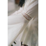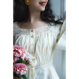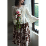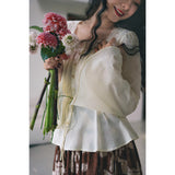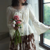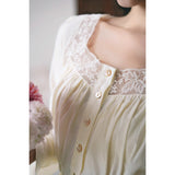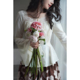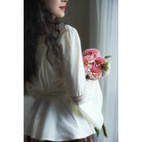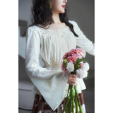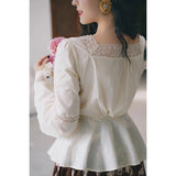 繊細なレースをあしらったスクエアネックが印象的な、ヴィンテージライクなブラウス。胸元には小さなボタンが並び、ふんわりと寄せられたギャザーが柔らかな表情を生み出しています。袖口は広がるベルスリーブになっており、手元に優雅な動きを添えるデザイン。クラシカルな気品とロマンティックな雰囲気を併せ持つ一着。