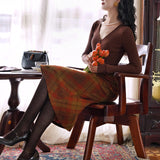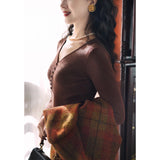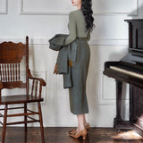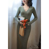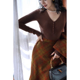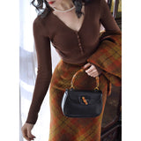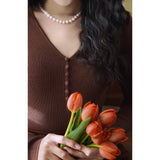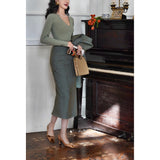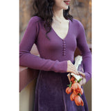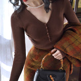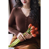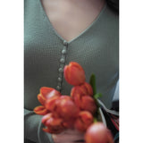 しなやかなリブ編みが縦のラインを美しく強調しながら、身体の動きに合わせて静かに表情を変えるニットトップス。深すぎないVネックは鎖骨の陰影を上品に引き立て、小さく連なるボタンが装飾というよりも呼吸のリズムのように胸元に穏やかなアクセントとなっています。指先まで伸びる袖は所作を美しく見せ、日常の何気ない瞬間さえも少しだけ詩的に変えてしまう。