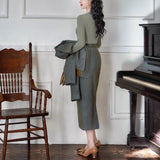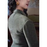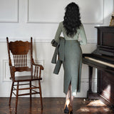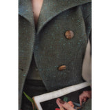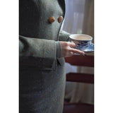 1950年代のシルエットから着想を得た、ミニマルで洗練されたエレガンスへと再構築した一着。大きく開くワイドラペルは、凛とした印象を与え、ウエストラインのカーブも、締めすぎることなく絶妙に整えられています。ハイウエストのスカートは、ストレートなラインで美しく落ち、裾にかけてわずかに内側へと収まる設計は、控えめでありながら、計算された巧みさを感じさせます。素材には、オリジナルで仕立てたツイード調のジャカード生地を使用。ほんのりと灰を含んだ色調が、静かで印象深い趣を放ちます。織り込まれたネップが、ささやかな光の粒となり、色合いに生き生きとした奥行きをもたらします。ワードローブの中で特別な存在となる、気品あふれる装い。