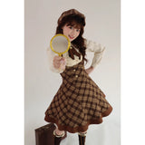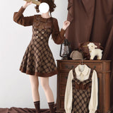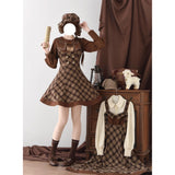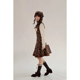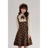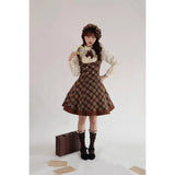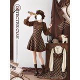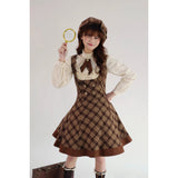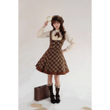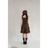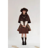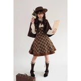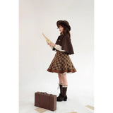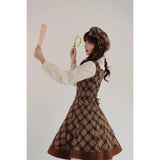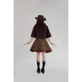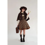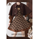 クラシカルな探偵譚の世界を思わせる、深みのあるブラウンを基調としたチェック柄のジャンパースカートは、ウエストに沿って静かに絞られた上身頃から、裾へ向かってやわらかく広がるフレアラインが印象的。ダブルボタンの配置と配色切り替えの裾が端正さと物語性を同時に宿しています。そこに重ねられたケープは、同系色の落ち着いたブラウンでまとめられ、丸みを帯びた襟と短めの丈感が肩元を包み込むように寄り添います。全体のシルエットに静かな重心と奥行きを与えながら、探偵が外套を翻して歩く一瞬の情景を想起させる佇まいを描き出しています。