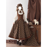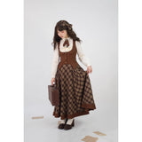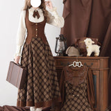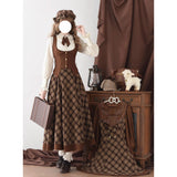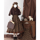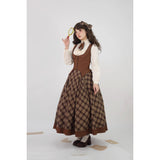 クラシカルな探偵譚の世界を思わせる、深みのあるブラウンのチェック柄が広がるスカートは、程よい厚みと落ち感をもった生地が円を描くように揺れ、裾に配された無地のブラウン切り替えが全体を静かに引き締めながら、歩みに合わせてクラシカルな余韻を残します。そこに重なるベストは、ウエストをすっきりと見せる立体的なカッティングと、縦に並ぶボタンが端正な印象を与えます。チェックのスカートと色調を揃えたことで、探偵の書斎に漂う知性と温もりをそのまま写し取ったような佇まいを描き出しています。