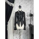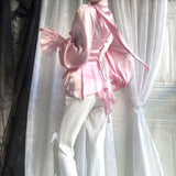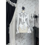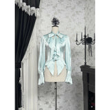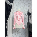 まるでヴィンテージ調のドレスシャツを現代的に昇華させたような、エレガントでドラマティックなブラウス。光沢のあるサテン生地で仕立てられており、大きめのボウタイが胸元にあしらわれ、フロントにはフリルが連なり、クラシカルな雰囲気を演出しています。袖口には広がるフリルカフが施され、華やかでロマンティックな印象を強調。ウエストラインはシェイプされ、裾はアシンメトリーに流れるようなデザインで、優雅さと立体感が際立っています。