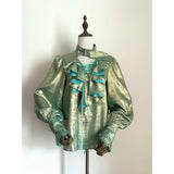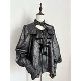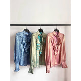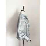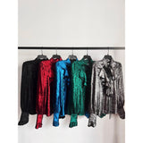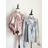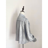 光を溶かし込んだように艶めくドレープが印象的なブラウス。光沢感のある生地が、角度によって霧のように輝き、幻想的な存在感を放ちます。胸元のリボンとフリルがクラシカルな気品を添え、首元のバックルデザインがモードな緊張感を引き締めます。夢と現実のあわいを歩くような、ロマンティックで少しミステリアスなアイテム。