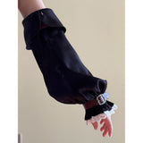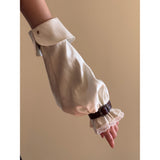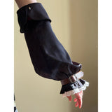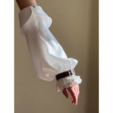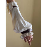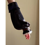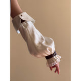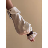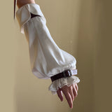 公爵邸のお嬢様みたいに演出してくれるヴィクトリアン調のアームスリーブ。袖口には繊細なレースをあしらい、さらに装飾的なバックル付きのレザーベルトで絞った特徴的なスタイル。ふんわりとしたシルエットとレースの繊細さ、そして革ベルトの重厚感が組み合わさり、クラシカルなファンタジー衣装を思わせる存在感を放っています。