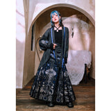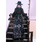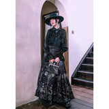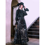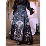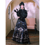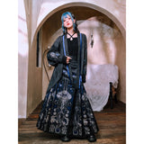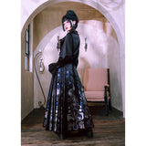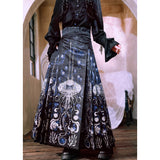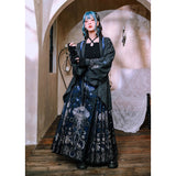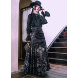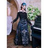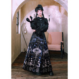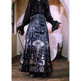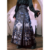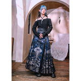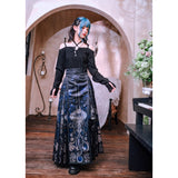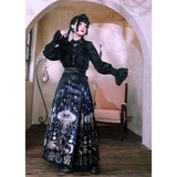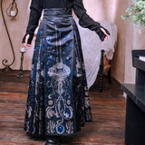 深い海を思わせるダークトーンをベースに、クラゲや珊瑚、貝殻などのモチーフを繊細に描いた幻想的なロングプリーツスカート。光を受けるたびにきらめくようなプリントが、まるで深海の神秘的な生物が漂う瞬間を切り取ったかのような雰囲気を纏わせています。重厚感のある黒と青のグラデーションに、白やシルバーの柄が浮かび上がり、アートピースのような存在感を放つ一着。