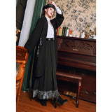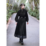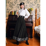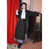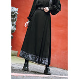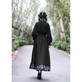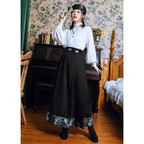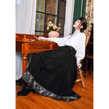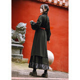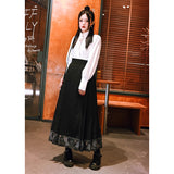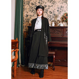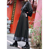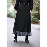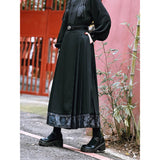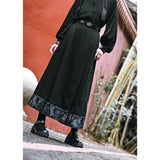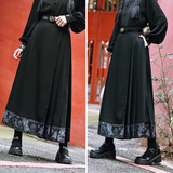 深い黒地に重厚な落ち感を持たせたロングプリーツスカート。裾部分には、古典的な碑刻拓本を現代の装飾芸術のスタイルで再構築した、緻密な兎の文様が帯のように巡り、物語性を漂わせています。シンプルながらも裾の装飾がアクセントとなり、静謐さと華やかさを同時に演出する一着。
