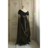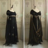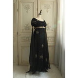 神秘的でドラマティックな雰囲気を演出する、漆黒の夜空を思わせるエンパイアスタイルのロングワンピース。透け感のある黒の生地に、夜空に瞬く星々が金色の刺繍が散りばめられ、胸下に配置されたレースのベルトがアクセントとなっています。袖はふんわりとしたパフスリーブで、長く垂れる透け感のあるストールが優雅さを添えています。後ろ姿にはリボンとドレープが重なりクラシカルで気品ある印象を与えます。