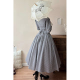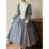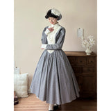 まるで19世紀の淑女のようなノスタルジックなワンピース。クラシカルな雰囲気を漂わせる、ヴィクトリアン調のチェック柄。細やかなモノトーンのギンガムチェック生地に、胸元と袖口のオフホワイト生地がアクセントを添えています。スタンドカラーと連なるボタンが清楚で気品ある印象を演出。ウエストから大きく広がるフレアスカートは、たっぷりとしたドレープで優雅なシルエットを描き、バックスタイルはリボンで結ばれ、後ろ姿まで上品に仕立てられています。
