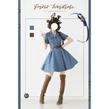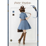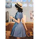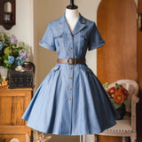 ヴィンテージライクで上品な佇まいを感じさせる、レトロなデニムワンピース。テーラードカラーとフロントに並ぶメタル調のボタンが印象的。胸元のポケットには細かなフリルが施されており、さりげない可愛らしさを添えています。ウエストにはブラウンベルトが配され、シルエットを引き締めながら女性らしいラインを強調しています。スカート部分はふんわりと広がるフレアシルエットで、動きに合わせて優雅な表情を生み出します。